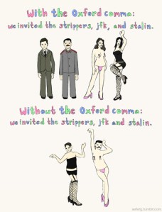 This week I stumbled across a grand debate, which has been ongoing for a while now, about the Oxford Comma. Also called a Serial or Harvard Comma, it is the optional comma used before the final “and” when writing lists. I’ve never been a big fan of using it. I’ve no idea why I’ve never been a big fan, I guess it just seemed superfluous, cluttered up the sentence, added in an extra pause that could better be used elsewhere. As a proud Canadian I use the British rule when questions of grammar come up (although I have been known to cheat on occasion).